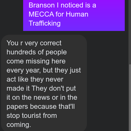We were approached by several concerned individuals on the streets of Branson who sought to inform us of a scourge of sex trafficking taking over the city.
